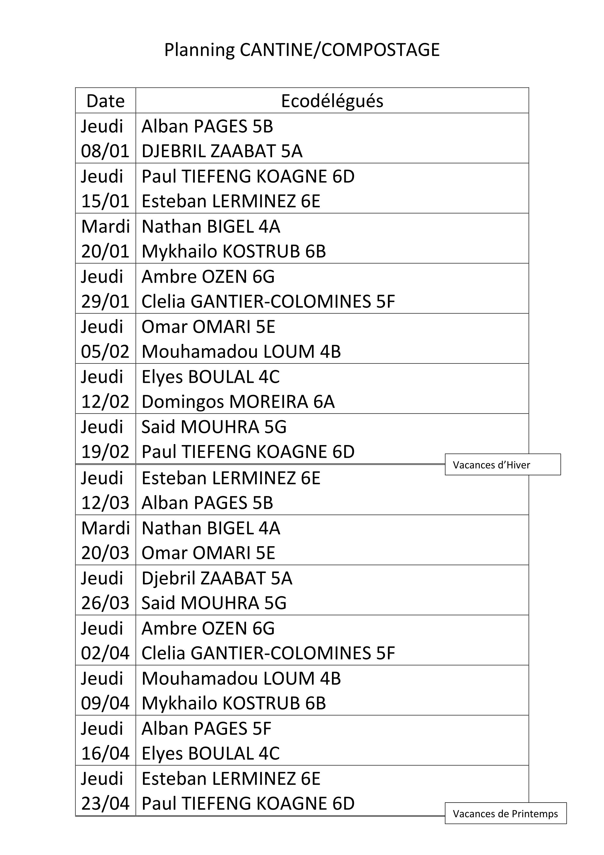 Voici le planning de tri des biodéchets de cantine et compostage.